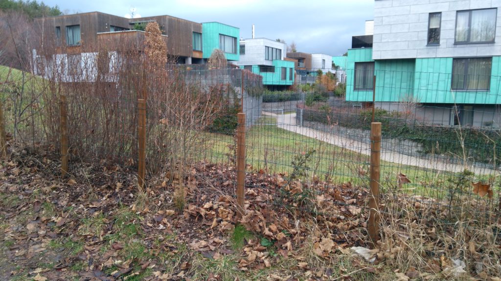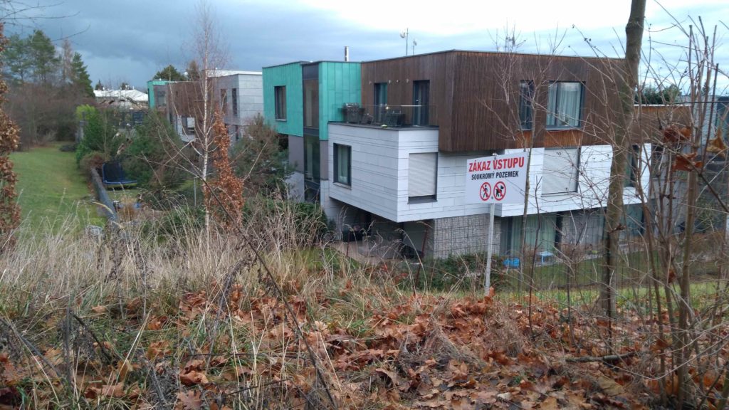 Zástavbu tvořily moderní vily, co vily, chtělo by se říct hrady a to nejen proto, že tak působily svojí mohutností, ale také kvůli obranným prvkům, které měly toto sídliště chránit. Nebyly tam valy a palisády, ale kamenné zdi a ploty a jistě i řada jiných zabezpečovacích prvků, které na první pohled nebyly viditelné. Projít bylo možné jen okolo, ulicí mezi vilami a starou zástavbou, ulice uvnitř byly nedostupné. Nejdřív ze všeho jsem si všimnul velkých cedulí hlásajících, že se jedná o soukromý pozemek a symbolů pro zákaz vstupu lidí a zvířat. Cestu k lesu jsem nejdřív přehlédl.